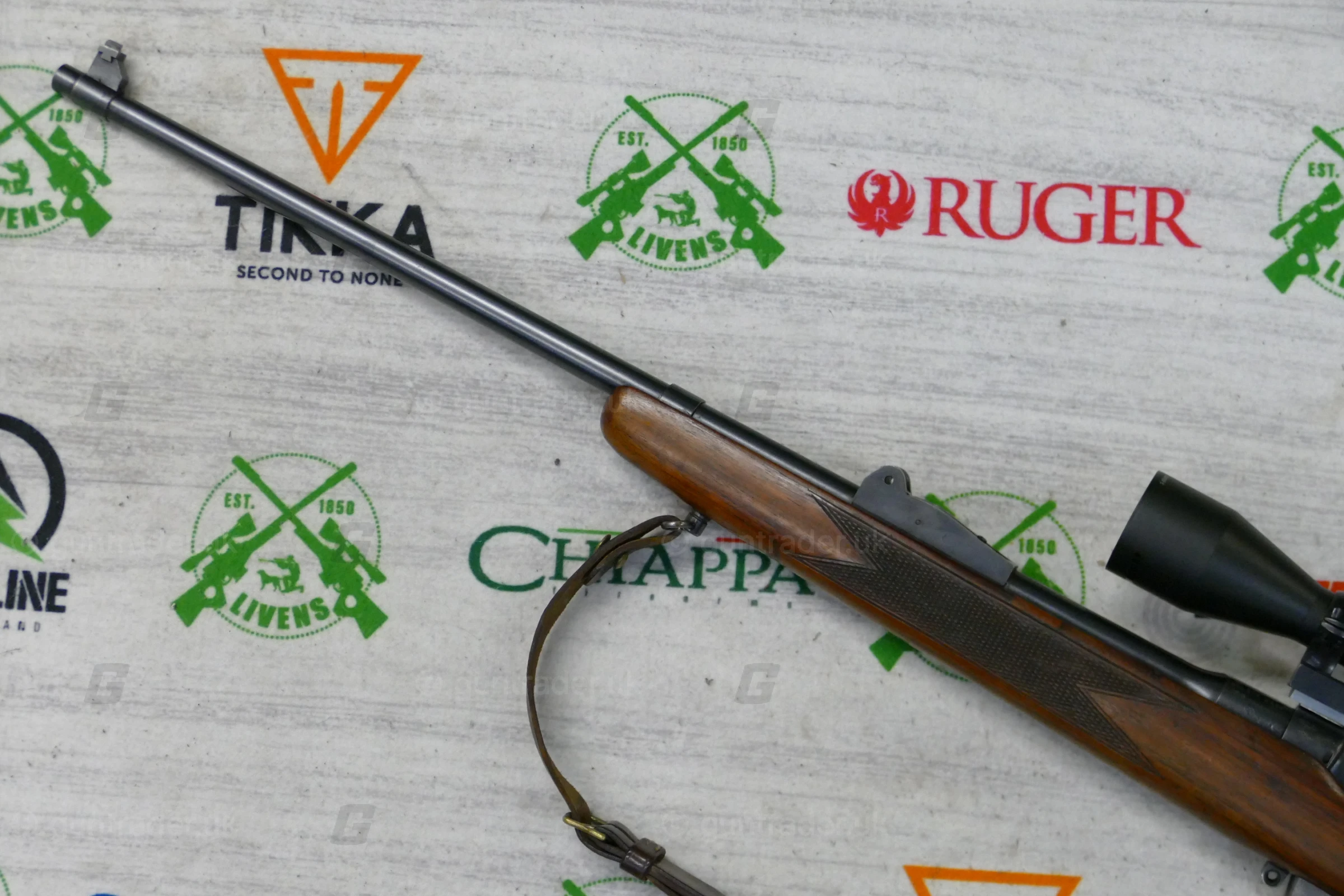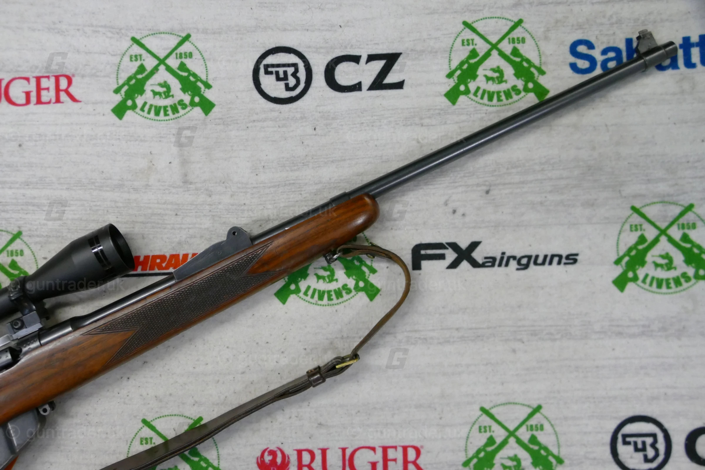 The front sight is also original and the barrel remains unthreaded. A scope rail has been fitted with what look to be Sako Optilock scope mounts to hold the scope.