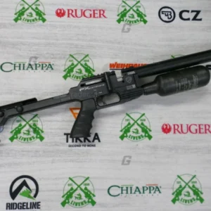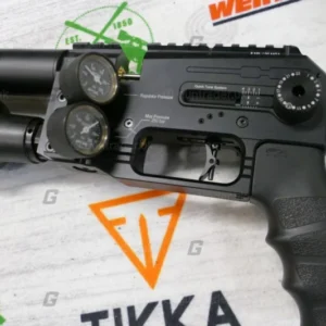 Air source is a 300cc carbon fiber bottle attached in the rear and is filled via a rear located foster quick disconnect. The Dynamic Block has a larger breech than previous rifles that allows projectiles up to 13mm in length. It uses the Standard Side-Shot Magazine but with a newly designed deeper lid to accommodate longer length slugs. The FX Panthera employs the Quick Tune System (the same as found on the FX Impact M3), uses a 20MOA picatinny scope rail, comes standard with a zero-angle AR grip, and has an ambidextrous sidelever cocking handle that is reversible to the left side of the rifle. Dual angled Manometers on the left side of the block show the bottle pressure and the regulated plenum pressure.