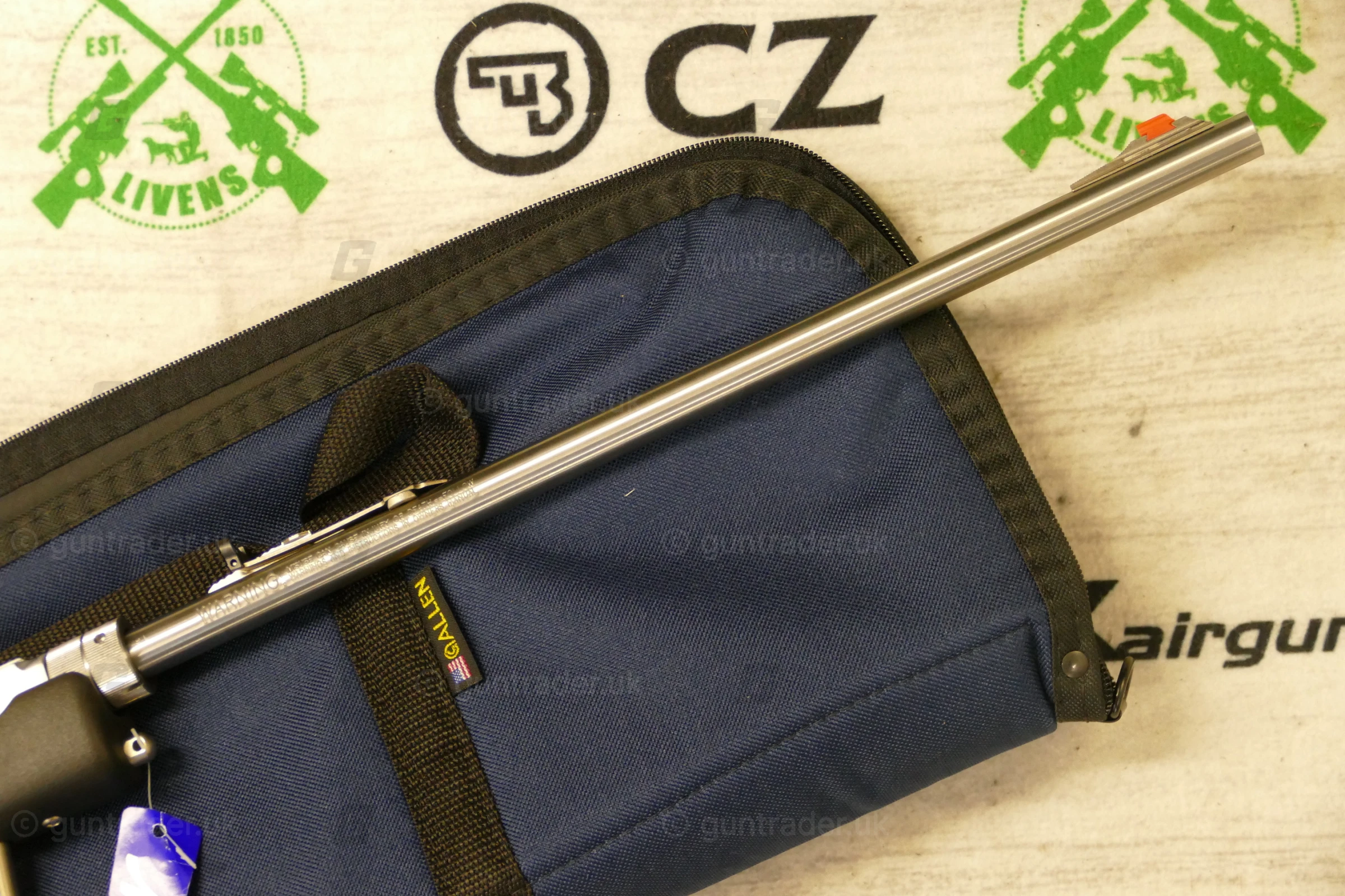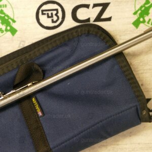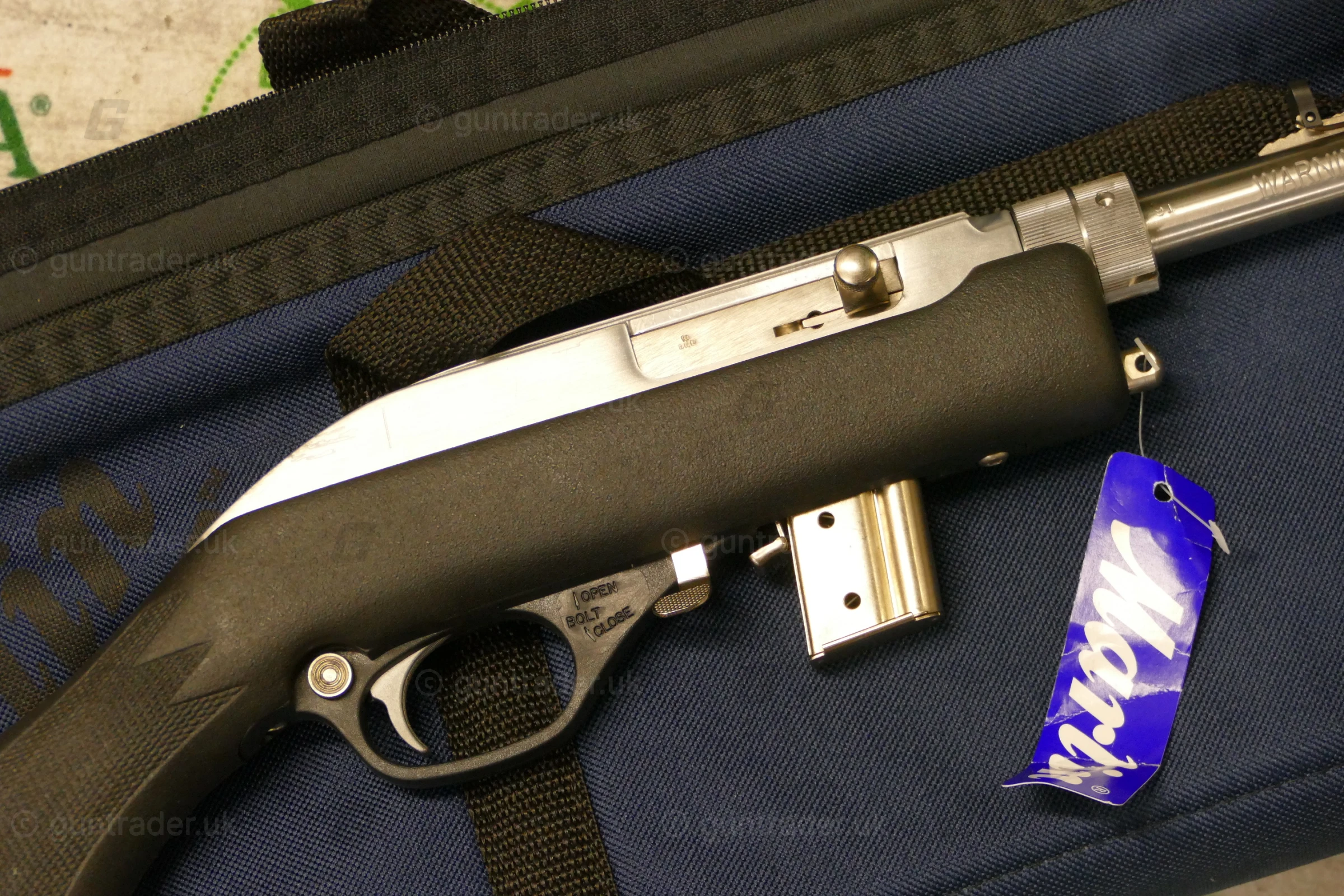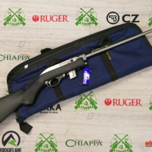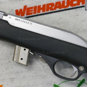 The rifle has an open rear sight and ramp front sight with high visibility orange post surrounded by a cutaway hood. The receiver has an integral .22 tip-off scope mounting rail. Swivel studs for a carrying strap are embedded in the synthetic stock. Included Marlin accessories are a 7-round metal magazine, a tool for adjusting the barrel nut, and a padded nylon carrying case designed to float in water.