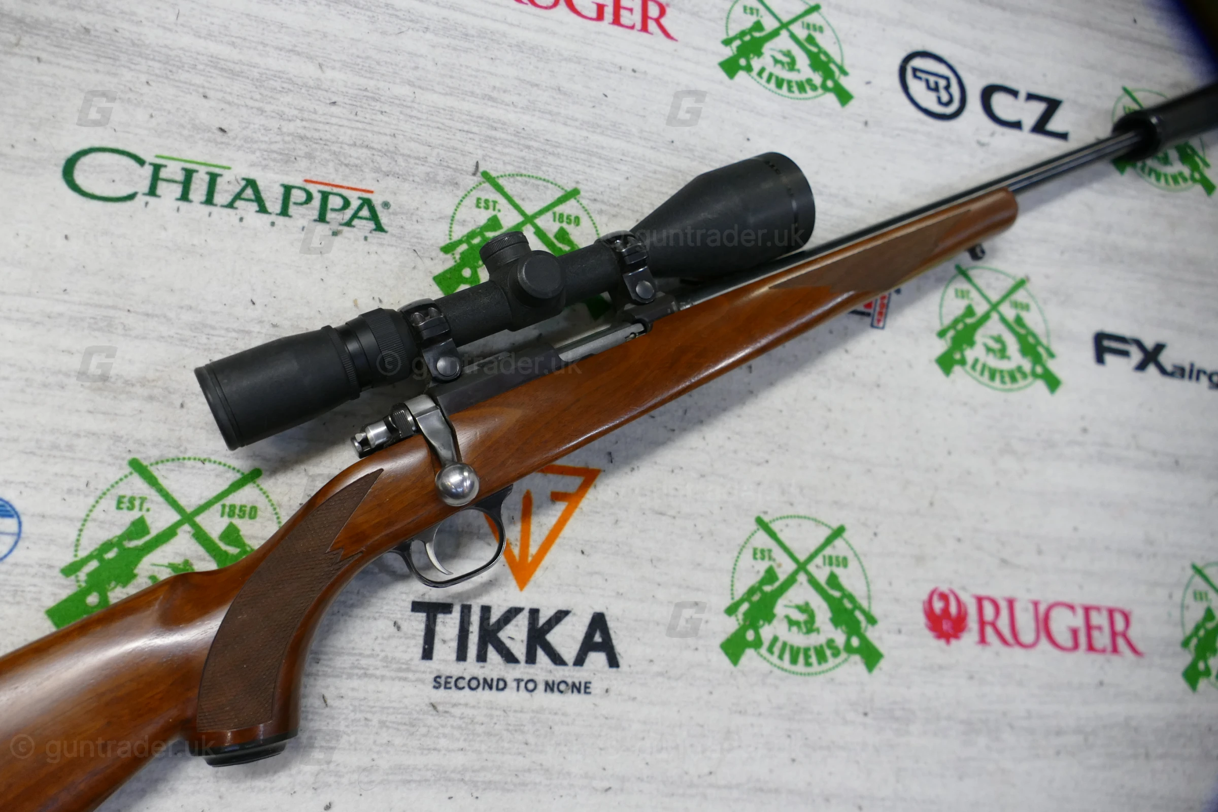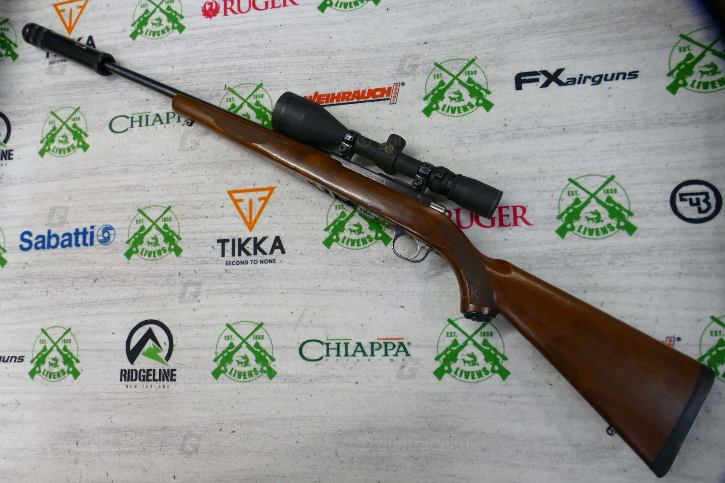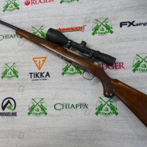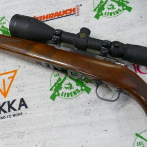 A nice looking rifle fitted with a Simmons Whitetail Clasic 3.5 x 50 scope and a Wild Cat Whisper sound moderator. Chambered in .17 HMR, this is an ideal hunting set-up.