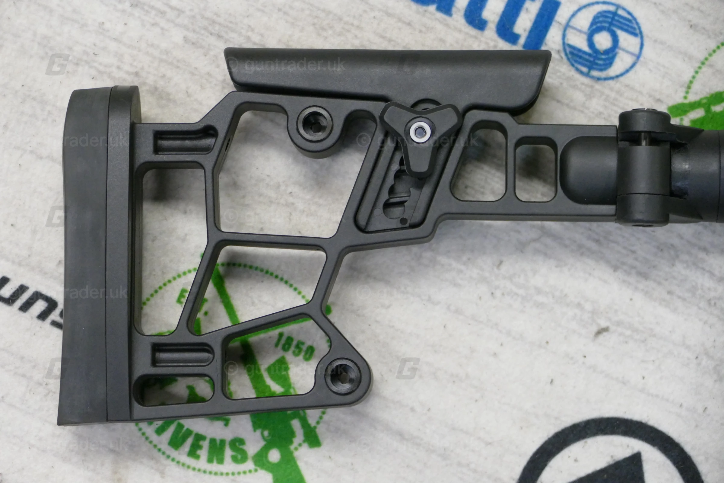 The polymer stock of the Sabatti ST-223 is foldable and skeletonized to contain the overall weight, with an adjustable cheek rest and equipped with a Bag Rider on the rear, lower surface; interfaced to the chassis via a threaded connection, it can be removed and replaced with an AR-15/M4 type buffer tube for the installation of aftermarket AR-15 compatible stocks.