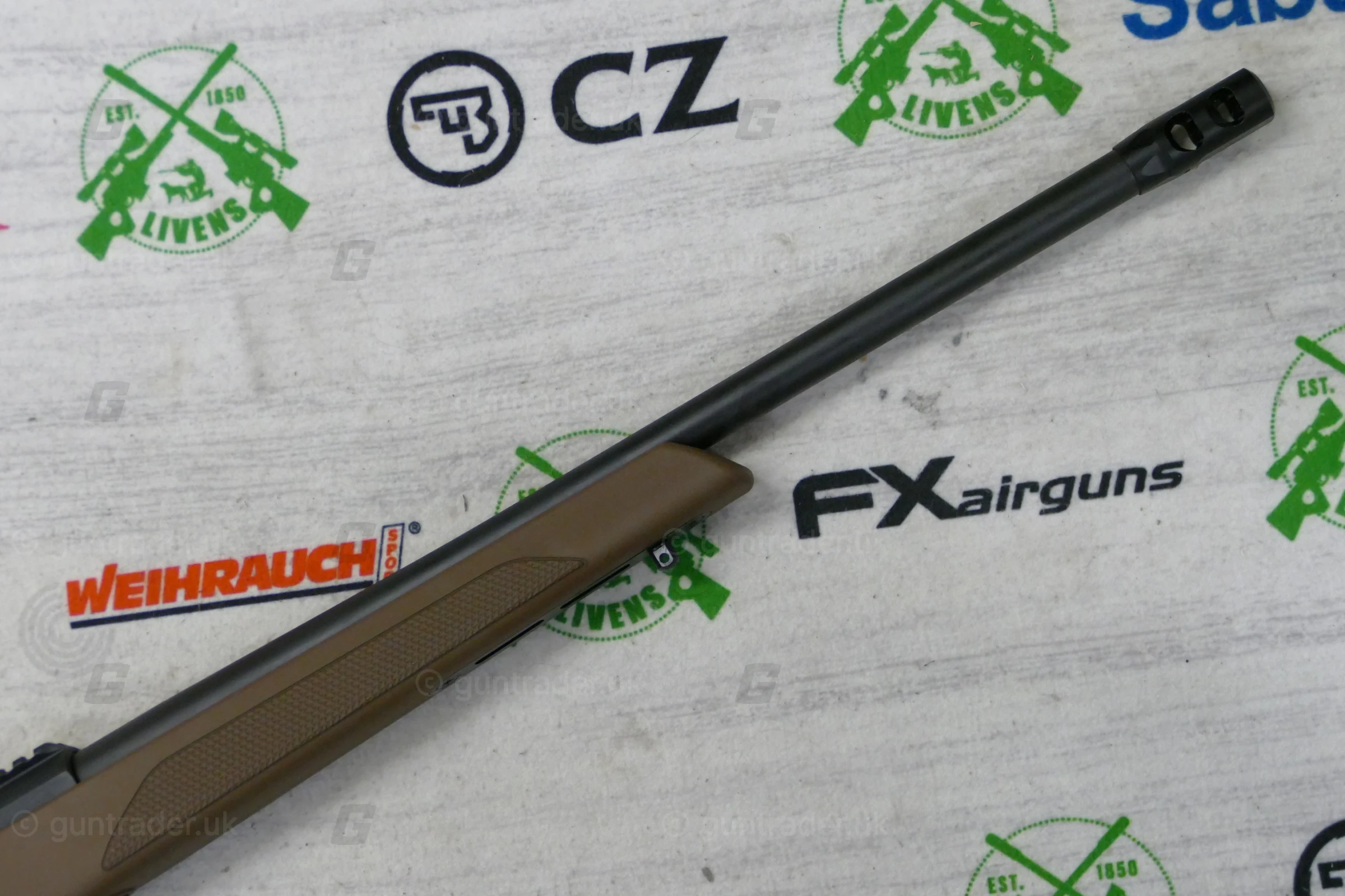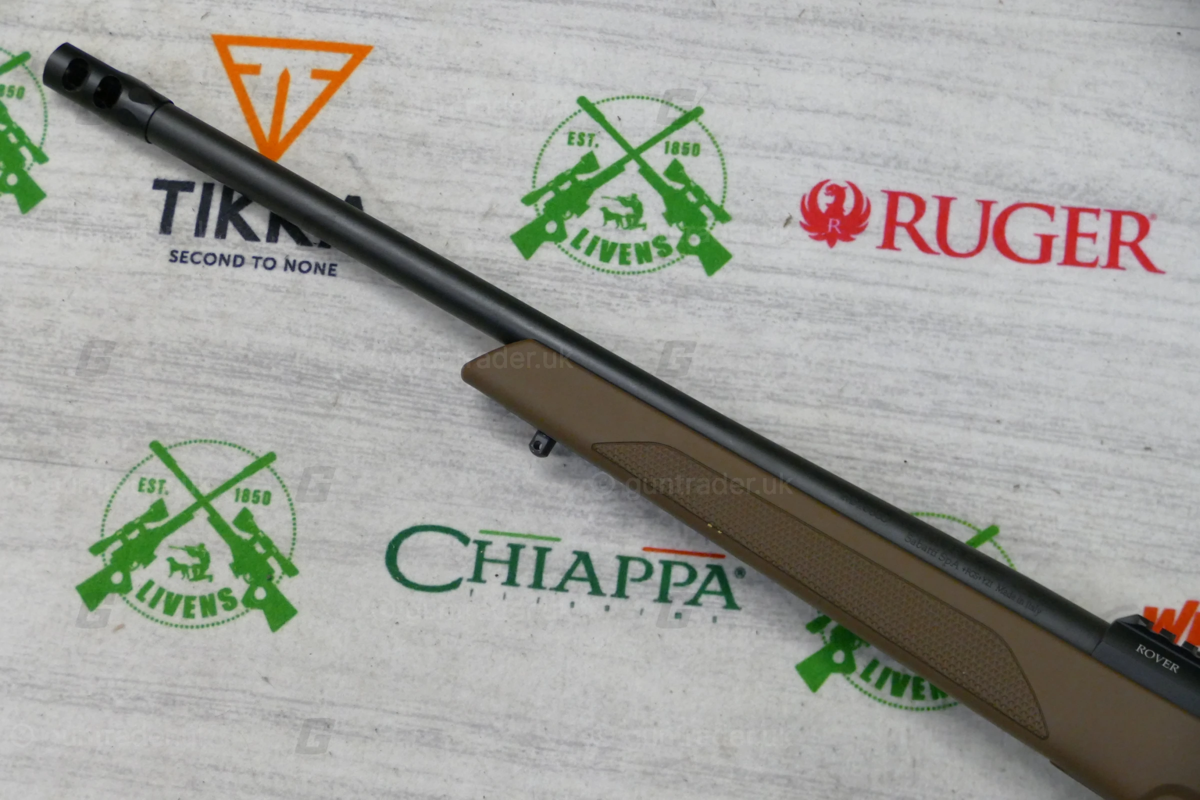 The Sabatti Rover Shooter barrel has a 20 mm (0.79”) diameter, it is blued without iron sights and mounts a muzzle brake mounted on a 5/8”-24 UNEF thread.