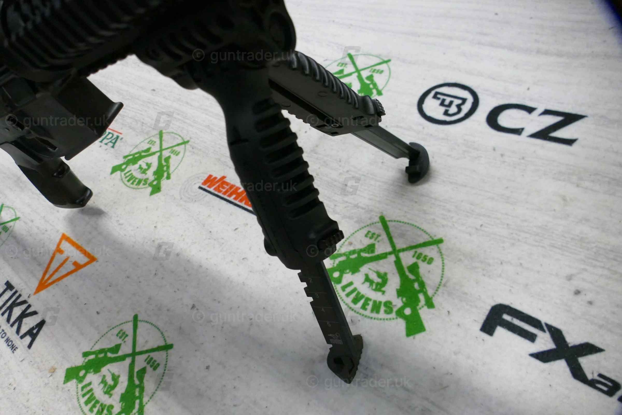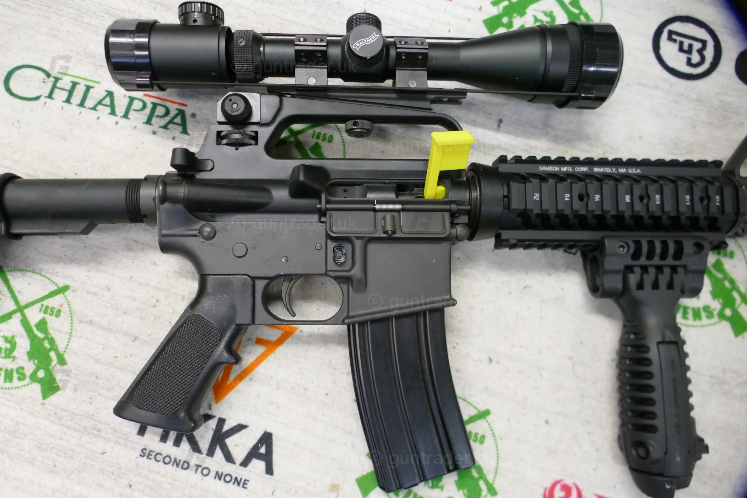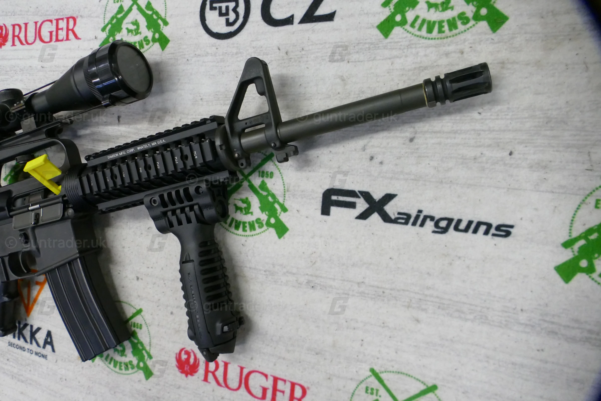 The rifle has an upgraded quadrail foreend and has a buffer tube on the rear which allows you to have an array of different stock options.