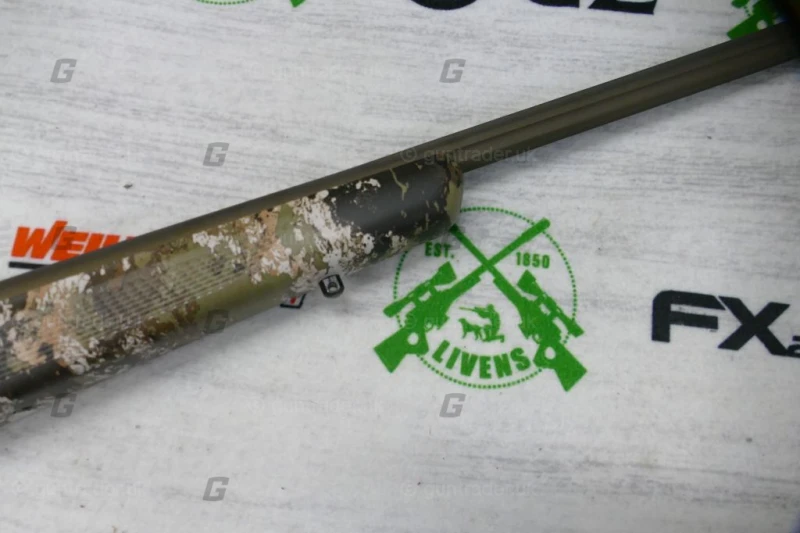 Once again, Tikka offers another work of art! The T3X in this Veil camo looks awesome! The barrel and action are Cerakoted in a burnt bronze finish. The barrel is fluted and is screw cut and comes with a pepper pot muzzle brake. The over sized bolt knob makes operating this bolt action a breeze and the fluted bolt looks great.